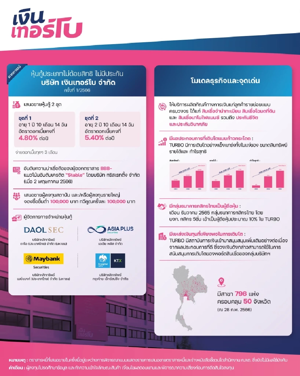 หุ้นกู้ TURBO เปิดให้จองซื้อในระหว่างวันที่ 20 - 22 มิถุนายน 2566 แก่ผู้ลงทุนสถาบัน และ/หรือผู้ลงทุนรายใหญ่ จองซื้อขั้นต่ำ 100,000 บาท และทวีคูณครั้งละ 100,000 บาท ทั้งนี้บริษัทฯ ได้รับการจัดอันดับความน่าเชื่อถือที่ “BBB-” แนวโน้ม “Stable” หรือ “คงที่” จากบริษัท ทริสเรทติ้ง จำกัด เมื่อวันที่ 2 พฤษภาคม 2566 สะท้อนถึงการที่บริษัทมีฐานเงินทุนที่แข็งแกร่งที่พร้อมจะเติบโต ทั้งนี้ หุ้นกู้ทั้ง 2 ชุดดังกล่าวจะเสนอขายผ่าน 4 บริษัทหลักทรัพย์ชั้นนำ ได้แก่
