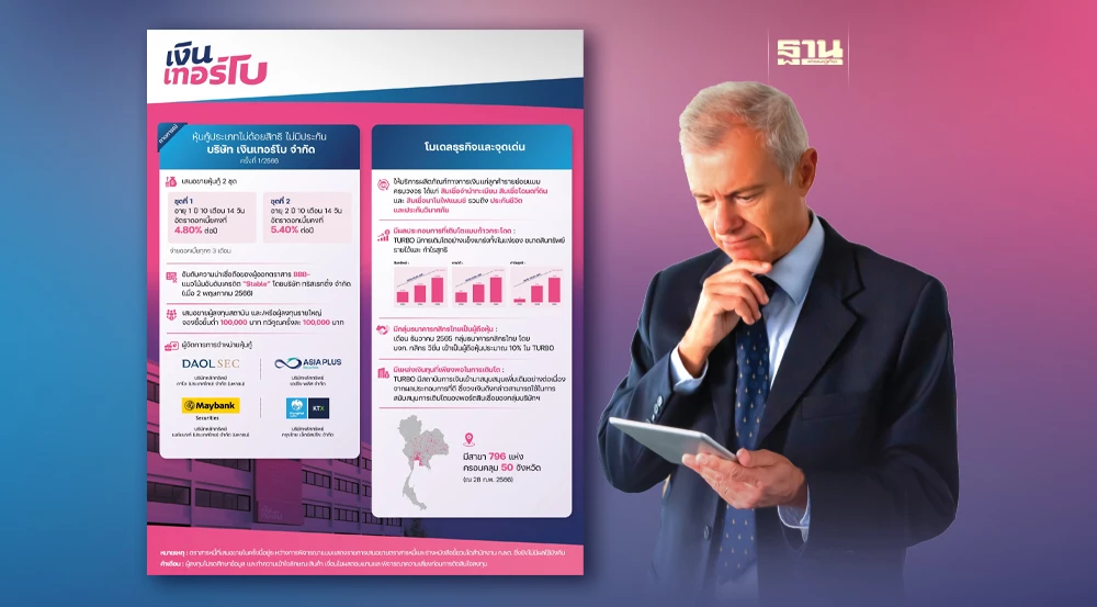 นายสุธัช เรืองสุทธิภาพ ประธานเจ้าหน้าที่บริหาร บริษัท เงินเทอร์โบ จำกัด หรือ TURBO เปิดเผยว่า กลุ่มบริษัทฯ เป็นผู้ให้บริการผลิตภัณฑ์ทางการเงินแก่ลูกค้ารายย่อยแบบครบวงจร ได้แก่ สินเชื่อจำนำทะเบียน สินเชื่อโฉนดที่ดิน และสินเชื่อนาโนไฟแนนซ์ รวมถึงประกันชีวิต และประกันวินาศภัย มีสาขาทั้งสิ้น 796 แห่ง ครอบคลุม 5 ภูมิภาค ในพื้นที่ 50 จังหวัด โดยกลุ่มบริษัทฯ มีสถานะทางการเงินที่แข็งแกร่ง จากผลประกอบการที่เติบโตแบบก้าวกระโดด
