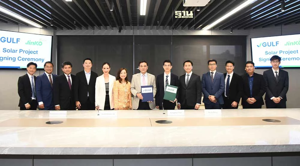นายสารัชถ์ รัตนาวะดี ประธานเจ้าหน้าที่บริหาร บริษัท กัลฟ์ เอ็นเนอร์จี ดีเวลลอปเมนท์ จำกัด (มหาชน) (GULF) ลงนามสัญญาหลักในการจัดหาแผงโซลาร์เซลล์ สำหรับโครงการโรงไฟฟ้าพลังงานแสงอาทิตย์ของกลุ่มบริษัทกัลฟ์และบริษัทในเครือ ระหว่างบริษัท กัลฟ์ เอ็นจิเนียริ่ง เซอร์วิสเซส จำกัด (บริษัทที่ GULF ถือหุ้นร้อยละ 100) กับบริษัท จินโกะ โซลาร์ ไห่หนิง จำกัด (JinkoSolar (Haining) Co., Ltd.) หนึ่งในผู้ผลิตแผงโซลาร์รายใหญ่ที่สุดในโลก