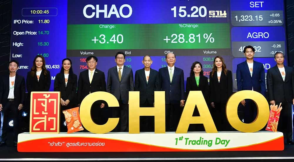 บริษัท เจ้าสัว ฟู้ดส์ อินดัสทรี จำกัด (มหาชน) หรือ CHAO หนึ่งในผู้นำธุรกิจผลิตและจำหน่ายขนมขบเคี้ยวและผลิตภัณฑ์แปรรูปจากเนื้อสัตว์ ภายใต้แบรนด์ “เจ้าสัว” และแบรนด์ “โฮลซัม (Wholesome)” ได้เริ่มทำการเข้าซื้อขายหุ้นในตลาดหลักทรัพย์แห่งประเทศไทย (SET) ในวันนี้ (9 ก.ค.67) เป็นวันแรก โดยที่ราคาเปิดตลาดอยู่ที่ระดับ 14.70 บาท/หุ้น เพิ่มขึ้น 2.90 บาท/หุ้น หรือคิดเป็นอัตราการขยายตัวที่ระดับ 24.57% จากราคาเสนอขายหุ้นสามัญเพิ่มทุนที่เสนอขายครั้งแรกแก่ประชาชนทั่วไป (IPO) ที่ระดับ 11.80 บาท/หุ้น