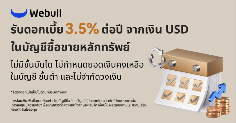 ลงทุนง่าย ได้ดอกเบี้ยทุกวัน! Webull ให้ดอกเบี้ยเงิน USD คงเหลือในบัญชี 3.5% ต่อปี พร้อมเทรดหุ้น ETF และ Option แบบไม่มีขั้นต่ำ ถอน-ฝากได้อิสระทุกเมื่อ