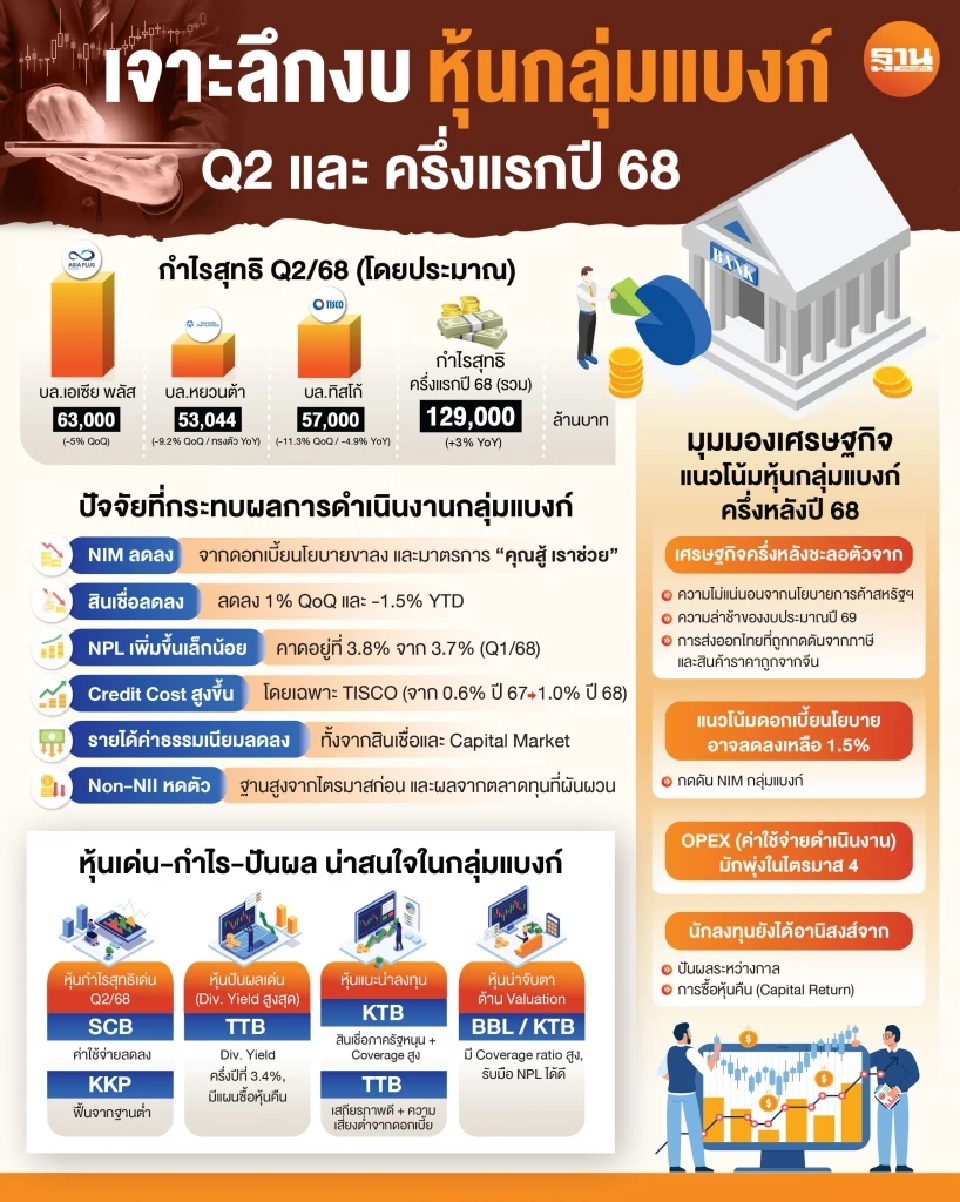 บล.หยวนต้า (ประเทศไทย) ให้มุมมองต่อหุ้นกลุ่มแบงก์ว่า คาดกำไรสุทธิในไตรมาส 2/68 ของกลุ่มธนาคารที่ 53,044 ล้านบาท ทรงตัวเทียบช่วงเดียวกันกับปีก่อน แต่ลดลง 9.2% จากไตรมาสก่อน กดดันจาก NIM ที่ปรับตัวลง และสินเชื่อที่ชะลอตัว ส่วนการตั้งสำรองและค่าใช้จ่ายดำเนินงานคาดปรับตัวลง
