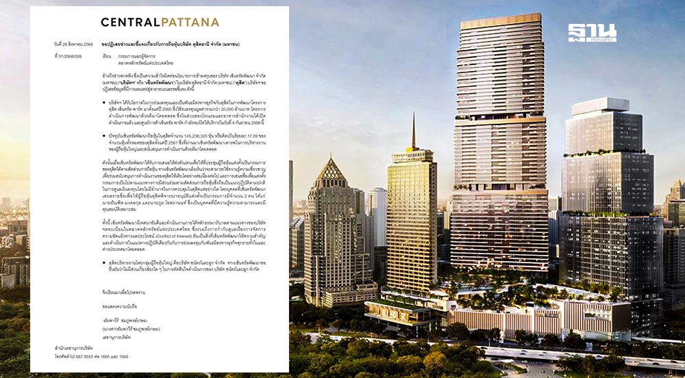 วันพฤหัสบดีที่ 28 สิงหาคม 2568 นางสาวอัมพาวีร์ ชมพูพงษ์เกษม เลขานุการ บริษัท เซ็นทรัล พัฒนา จำกัด (มหาชน) หรือ CPN ได้ทำหนังสือถึง กรรมการและผู้จัดการ ตลาดหลักทรัพย์แห่งประเทศไทย เรื่อง ขอปฏิเสธข่าวและชี้แจงเกี่ยวกับการถือหุ้น บริษัท ดุสิตธานี จำกัด (มหาชน) หรือ DUSIT อ้างถึงข่าวพาดพิง ซึ่งเป็นความเข้าใจผิดต่อนโยบายการเข้าลงทุนของ บริษัท เซ็นทรัลพัฒนา จำกัด(มหาชน) (“บริษัทฯ” หรือ “เซ็นทรัลพัฒนา”) ในบริษัท ดุสิตธานี จำกัด (มหาชน) (“ดุสิต”)บริษัทฯ ขอปฏิเสธข้อมูลที่มีการเผยแพร่สู่สาธารณะและขอชี้แจง ดังนี้