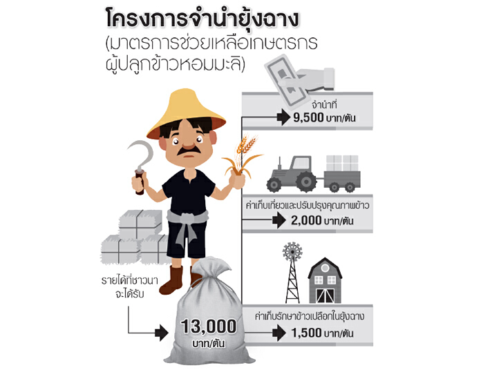 แหล่งข่าวจากกระทรวงเกษตรและสหกรณ์ เผยข้อมูลว่าในปีเพาะปลูก 2559/60(ตั้งแต่ 1 พ.ค.-30 ก.ย.59)ประเทศไทยมีการปลูกข้าวรอบที่ 1 ไปแล้วทั้งสิ้น 57.29 ล้านไร่ คาดจะได้ผลิตทั้งหมดประมาณ 25.19 ล้านตันข้าวเปลือก(มากกว่าเป้าหมาย 2.31 ล้านตัน) ในจำนวนนี้เป็นผลผลิตข้าวหอมมะลิมากที่สุด 10.79 ล้านตัน รองลงคือข้าวเจ้า 7.13 ล้านตัน ข้าวหอมปทุมธานี 1.0 ล้านตัน และข้าวอื่นๆ 0.03 ล้านตัน โดยผลผลิตข้าวทั้งหมดจะออกมามากที่สุดในช่วงเดือนพฤศจิกายนนี้ปริมาณ 14.96 ล้านตัน หรือสัดส่วน 59% ของผลผลิตทั้งหมด ดังนั้นรัฐบาลจึงเลือกที่จะช่วยเหลือผู้ปลูกข้าวหอมมะลิก่อน