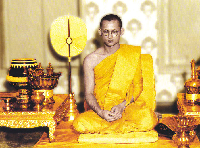 พระบาทสมเด็จพระปรมินทรมหาภูมิพลอดุลยเดชฯ ทรงประกอบพิธีอุปสมบทผนวชที่พระอุโบสถวัดพระศรีรัตนศาสดาราม เมื่อวันที่ 22 ตุลาคม 2499 โดยมีสมเด็จพระสังฆราชเจ้ากรมหลวงวชิรญาณวงศ์ทรงเป็นพระราชอุปัชฌาย์ สมเด็จพระวนรัตน์ วัดเบญจมบพิตร เป็นพระอนุศาสนาจารย์ และพระศาสนโสภณ วัดมกุฏกษัตริยาราม เป็นพระกรรมวาจาจารย์ มีพระสงฆ์นั่งหัตถบาส รวม 30 รูป ทรงได้รับพระสมณฉายาว่า “ภูมิพโลภิกขุ” อันมีความหมายว่า พระภิกขุผู้เป็นกำลัง หรือพลังแห่งแผ่นดิน