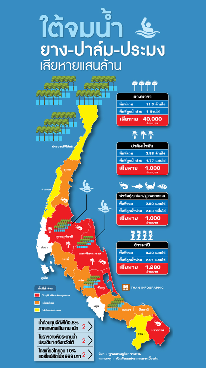 นํ้าท่วมใหญ่ 12 จังหวัดปักษ์ใต้ทุบเศรษฐกิจ-กำลังซื้อฟุบ ยาง ประเมินเสียหายจริงกว่าล้านไร่ กระทบรายได้หายทั้งระบบกว่าแสนล้าน ปาล์ม ฟาร์มกุ้งข้าวนาปีรอเก็บเกี่ยวโดนถ้วนหน้า หอการค้าประเมินกระทบจีดีพีใต้หาย 0.8% รัฐออกมาตรการภาษีบริจาคช่วยใต้ ค้าปลีกยันสต๊อกมีพอรองรับไม่ขาดแคลน