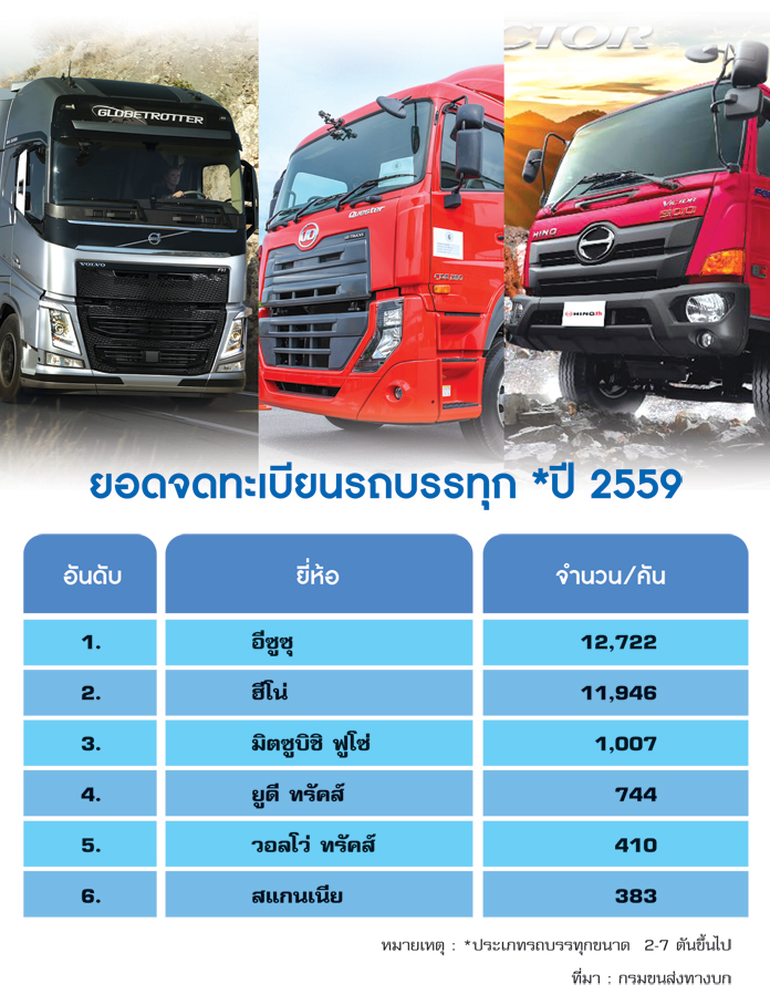 คึกคักเกินคาดสำหรับภาพรวมตลาดรถบรรทุก – รถหัวลากในปี 2559 ที่ปิดตัวเลขการขายอยู่ที่ 28,302 คัน เติบโต 4.40% เมื่อเทียบกับปีก่อนหน้าที่ขายได้ 27,105 คัน ส่วนแนวโน้มปีนี้ คาดว่าสถานการณ์ยังฉลุยหรือมีโอกาสขยายตัวเล็กน้อย จากอานิสงค์โครงการก่อสร้าง - เมกะโปรเจ็กต์ของรัฐบาลที่ยังเดินหน้าเต็มสูบ