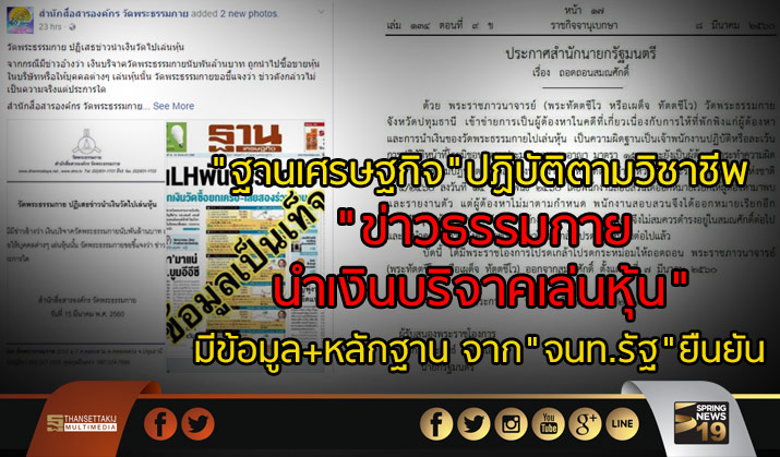 -16มีค.60-ผู้สื่อข่าวรายงานว่า กรณีหนังสือพิมพ์ฐานเศรษฐกิจ สื่อในเครือสปริง กรุ๊ป ฉบับ 3244 ระหว่างวันที่ 16-18 มี.ค.2560 เปิดเผยว่า "ตะลึง! เงินบริจาควัดพระธรรมกายนับพันล้าน ถูกโยกไปเปิดบัญชีผ่าน บล.แลนด์ แอนด์ เฮ้าส์ฯ ซื้อขายหุ้นกลุ่มแลนด์แอนด์เฮ้าส์-โฮมโปร-แบงก์แลนด์และหุ้นในมือของเสี่ยสอง กระทรวงยุติธรรมพบเสียหายหนัก"
