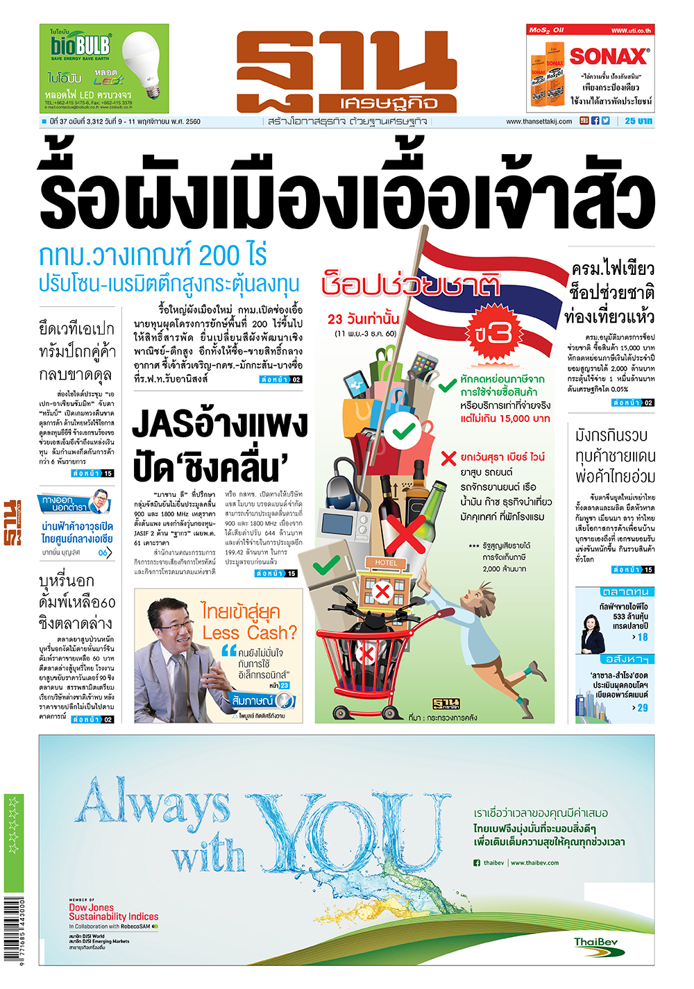 หน้าหนึ่ง! หนังสือพิมพ์ฐานเศรษฐกิจ ปีที่ 37 ฉบับที่ 3,312 วันที่ 9 – 11 พฤศจิกายน พ.ศ. 2560