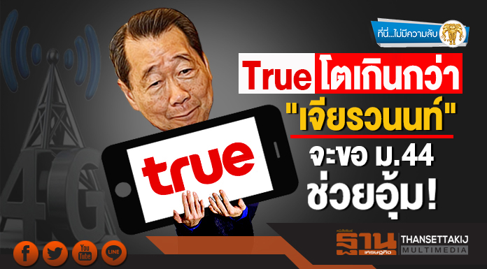 True เป็นบริษัทสื่อสารยักษ์ใหญ่ที่แจ้งความจำนง ให้ กสทช.ช่วยเหลือ ฐากร ตัณฑสิทธิ์ เลขาฯ กสทช.กล้าหาญชาญชัย เสนอที่จะให้ 'ลุงตู่' พล.อ.ประยุทธ์ จันทร์โอชา ใช้ ม.44 อุ้มกิจการมือถือด้วยการพักการผ่อนชำระ 4 ปี ให้คิดดอกเบี้ยแค่ร้อยละ1.5 แต่ยังดีที่ 'ลุงตู่' สั่งให้ทบทวนทันควัน เพราะมีกลิ่นทะแม่งๆ ที่สังคมกำลังตรวจสอบและเห็นว่าหากมีการใช้ม.44 ช่วยค่ายมือถือเท่ากับเป็นการช่วยเหลือคนรวยโดยแท้ ตอนที่แล้ว “เอราวัณ” ได้นำเสนอข้อมูล 11 ปีแห่งการปันผลเอากำไรกลับของผู้ถือหุ้น ADVANC เจ้าของผลิตภัณฑ์มือถือ AIS ให้เห็นแล้วว่าสมควรที่รัฐจะเอาเงินของประชาชนไปช่วยเหลือหรือไม่