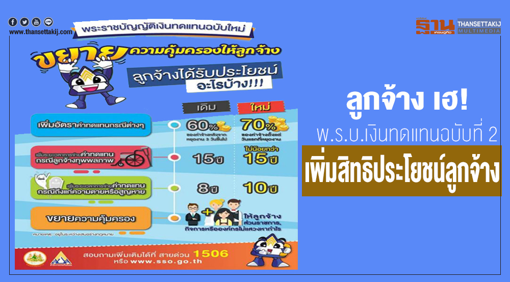 - เพิ่มอัตราค่าทดแทนกรณีต่างๆ จาก ร้อยละ 60 เป็นร้อยละ 70 ของค่าจ้างรายเดือน