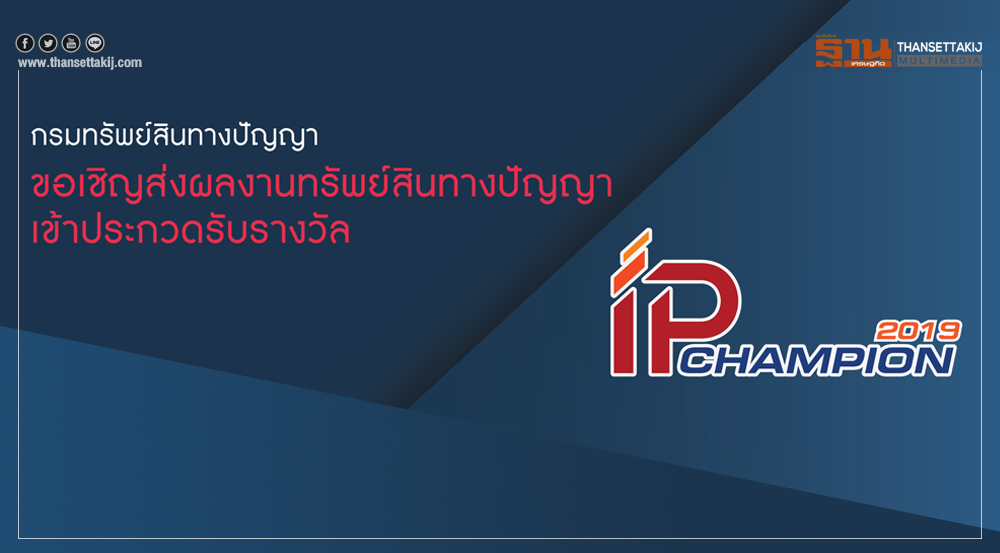กรมทรัพย์สินทางปัญญา ขอเชิญบุคคลธรรมดา เจ้าของกิจการ รัฐวิสาหกิจ หน่วยงานของรัฐ และสถาบันอุดมศึกษาทั้งรัฐและเอกชน ที่มีทรัพย์สินทางปัญญาจดทะเบียนหรือจดแจ้งไว้กับกรมทรัพย์สินทางปัญญาแล้ว รวม 4 ประเภท ได้แก่ สิทธิบัตรการประดิษฐ์ สิทธิบัตรการออกแบบผลิตภัณฑ์ ลิขสิทธิ์ และเครื่องหมายการค้า เข้าร่วมการคัดเลือกเพื่อรับมอบรางวัลการสร้างสรรค์และการใช้ประโยชน์ทรัพย์สินทางปัญญาดีเด่น (IP Champion 2019)