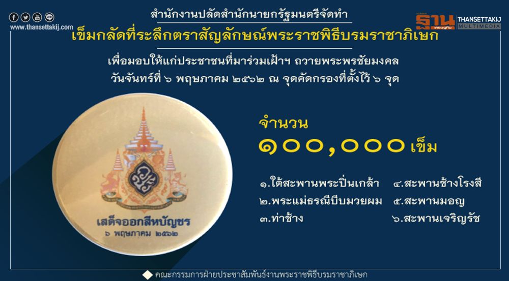 สำนักงานปลัดสำนักนายกรัฐมนตรีจัดทำเข็มกลัดที่ระลึกตราสัญลักษณ์พระราชพิธีบรมราชาภิเษก พิมพ์ข้อความ“เสด็จออก สีหบัญชร ๖ พฤษภาคม ๒๕๖๒”จำนวน ๑๐๐,๐๐๐ เข็ม