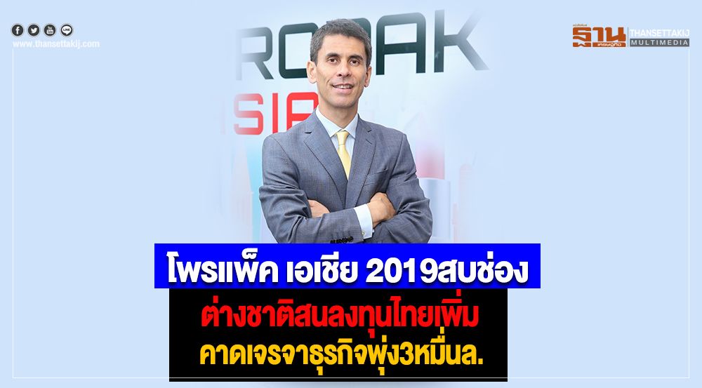 ภาคธุรกิจมองบวกการลงทุนภาคอุตสาหกรรมไทยรับผลบวกสงครามการค้าสหรัฐ-จีนส่อแววยืดเยื้อ ทุนต่างชาติหันจับตลาดเอเชียและอาเซียน เล็งเพิ่มฐานการผลิตในภูมิภาค ส่งผลงานโพรแพ็ค เอเชีย 2019 สุดคึกคักหลังบริษัทชั้นนำระดับโลกขนนวัตกรรมเทคโนโลยีเครื่องจักรและโซลูชั่น ล่าสุดรวมโชว์ในงานฯ กว่า 2 หมื่นรายการ ช่วยดันอุตสาหกรรมไทยสู่อุตสาหกรรมแห่งอนาคต คาดมีผู้เข้าร่วมงานกว่า 50,000 คน มูลค่าการเจรจาธุรกิจพุ่งสูงกว่า 30,000 ล้านบาท