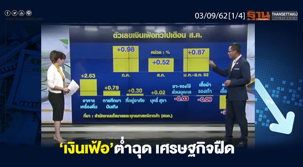 NEWS ROOM ห้องข่าวเศรษฐกิจ 03/09/62 ทุกวันจันทร์-ศุกร์ เวลา 10.30-11.50 น. เจาะลึกประเด็น ‘เงินเฟ้อ’ ต่ำฉุดเศรษฐกิจฝืด เป็นอย่างไรติดตามได้จากรายการ