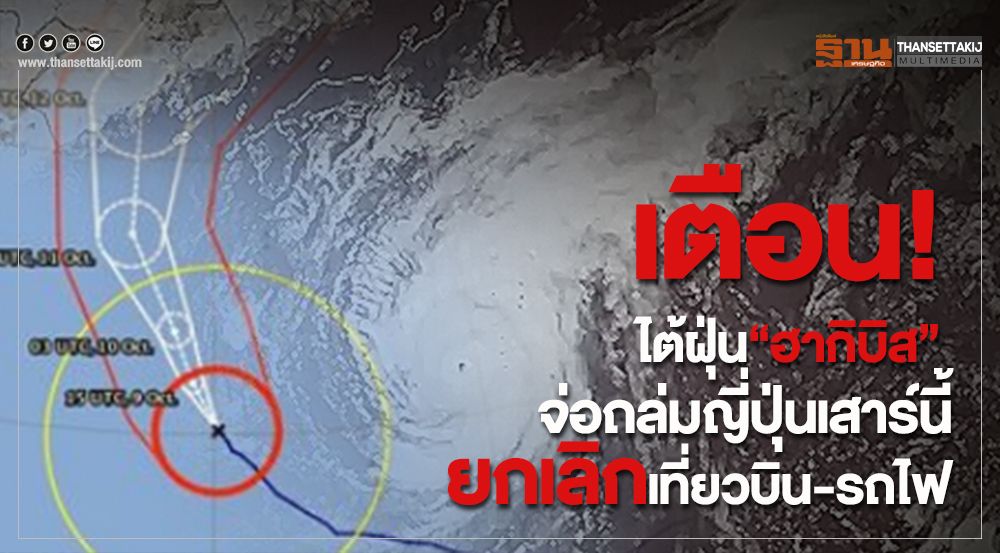 เตือนรับมือซุปเปอร์ไต้ฝุ่น“ฮากิบิส” จ่อถล่มญี่ปุ่นเสาร์นี้ สายการบิน-รถไฟ เตรียมงดให้บริการ สำนักอุตุนิยมวิทยาญี่ปุ่นเผยไต้ฝุ่นฮากิบิสจะขึ้นฝั่งด้านตะวันออกของประเทศ คาดว่าจะเกิดพายุลมแรงและฝนตกหนักในบริเวณกว้างรวมถึงกรุงโตเกียว ขณะที่สถานเอกอัครราชทูต ณ กรุงโตเกียว เตือนคนไทยติดตามสถานการณ์ ระวังภัยจากฝนตกหนักและลมกระโชกแรง