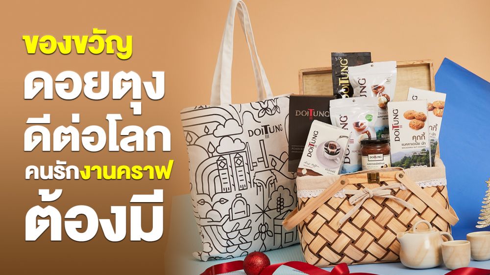 ของขวัญที่เหมาะกับทุกเพศทุกวัย ใครได้ไปปลื้มชัวร์ แนะนำตัวเลือกที่คลาสสิกอย่าง กระเช้ารวมผลิตภัณฑ์ดอยตุง Size S,M,L,XL ที่ใส่ความตั้งใจและความอร่อยในทุกผลิตภัณฑ์ อาทิ คุกกี้, แมคคาเดเมียอบ รสชาติต่างๆ, แมคคาเดเมีย นัท สเปรด รสช็อกโกแล็ตและธรรมชาติ, ดริป คอฟฟี่ พร้อมแก้วกาแฟเซรามิก คอลเลกชั่นใหม่ และถุงผ้าลายดอยตุง (DoiTung Tote Bag) ราคาเริ่มต้นที่ 1,090-2,690 บาท