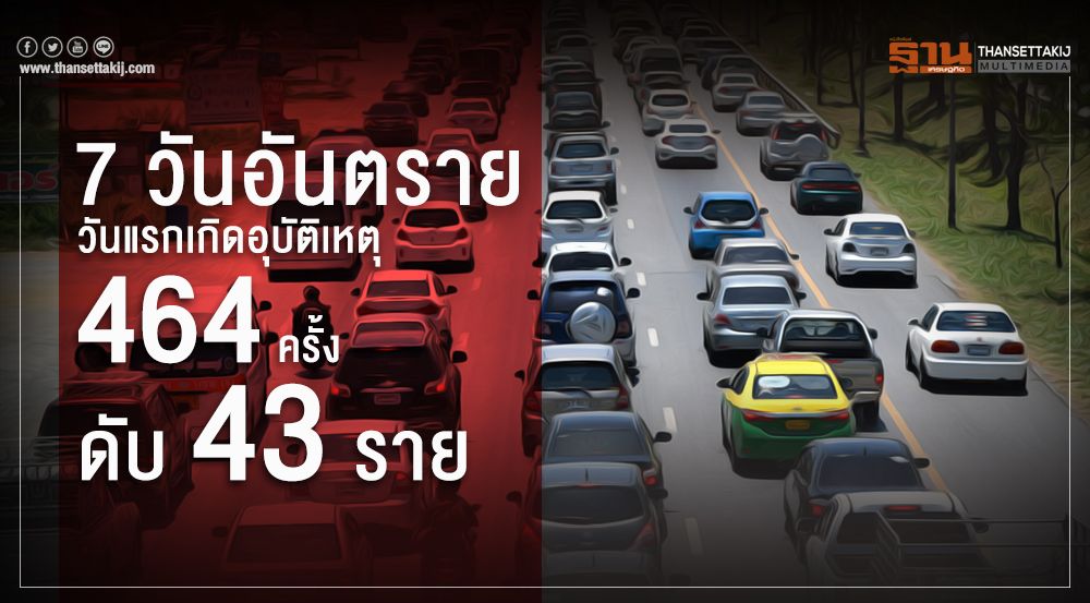 วันที่ 28 ธ.ค.2562 ศูนย์อำนวยการป้องกันและลดอุบัติเหตุทางถนนช่วงเทศกาลปีใหม่ พ.ศ. 2563 (ศปถ.) กรมป้องกันและบรรเทาสาธารณภัย สรุปอุบัติเหตุทางถนน ในช่วงวันที่ 27 ธ.ค.2562 มีสถิติการเกิดอุบัติเหตุ 464 ครั้ง เพิ่มขึ้น 45 ครั้ง คิดเป็น +10.74% จากในช่วงเดียวกันของเทศกาลปีใหม่ 2562 มีผู้บาดเจ็บ 466 คน เพิ่มขึ้น 38 คน คิดเป็น +8.88% จากในช่วงเดียวกันของเทศกาลปีใหม่ 2562 และผู้เสียชีวิต 43 คน ลดลง 2 คน คิดเป็น -4.44% จากในช่วงเดียวกันของเทศกาลปีใหม่ 2562