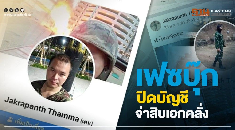 หลังจากเหตุการณ์กราดยิงที่จังหวัดโคราช จนสำนักข่าวทั่วโลกจับตามอง ล่าสุด เฟซบุ๊ก ได้ปิดบัญชีคนร้าย จ.ส.อ.จักรพันธ์ ถมมา ออกจากเฟซบุ๊กแล้ว ที่ใช้ชื่อบัญชี Jakrapanth Thomma โพสต์ข้อความและวิดีโอสดที่มีเนื้อหารุนแรง ซึ่งขัดกับนโยบายของเฟซบุ๊ก
