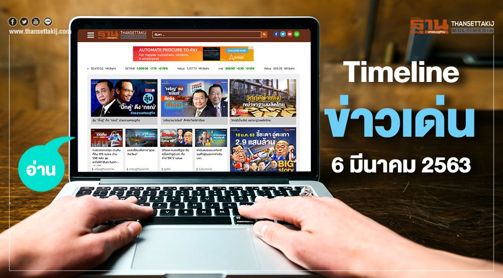 "ฐานเศรษฐกิจ" รวบรวมไฮไลต์สถานการณ์ข่าวที่จะเกิดขึ้นในรอบวันศุกร์ที่ 6 มี.ค. 63 ไฮไลต์วันนี้ พล.อ.ประยุทธ์ จันทร์โอชา นายกรัฐมนตรี เป็นประธานการประชุมคณะกรรมการรัฐมนตรีฝ่ายเศรษฐกิจนัดพิเศษ (ครม.เศรษฐกิจ) ที่ทำเนียบรัฐบาล เวลา 09.30 น. หลังจากนายกรัฐมนตรีมีข้อสั่งการเกี่ยวกับมาตรการเร่งด่วนเพื่อแก้ปัญหาจากโรคติดเชื้อไวรัสโคโรนา 2019 โดยหนึ่งในข้อสั่งการคือให้นายสมคิด จาตุศรีพิทักษ์ รองนายกรัฐมนตรี และนายอุตตม สาวนายน รัฐมนตรีว่าการกระทรวงการคลัง หามาตรการลดผลกระทบและกระตุ้นเศรษฐกิจเสนอต่อครม.เศรฐกิจ
