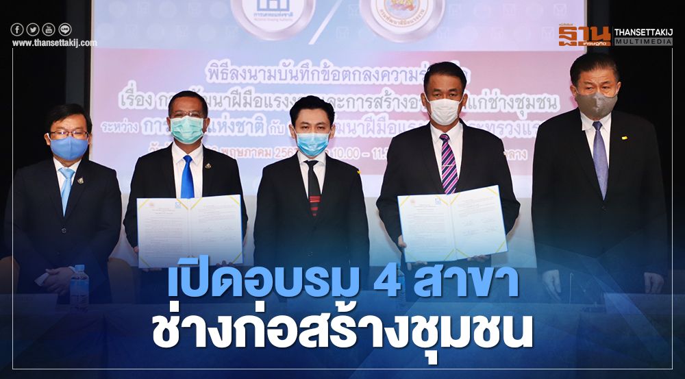 วันที่ 26 พฤษภาคม 2563 ณ ห้องวทัญญู ณ ถลาง ชั้น 2 การเคหะแห่งชาติ สำนักงานใหญ่ กรุงเทพมหานคร นายธวัช เบญจาทิกุล อธิบดีกรมพัฒนาฝีมือแรงงาน (กพร.) กระทรวงแรงงาน และนายวิญญา สิงห์อินทร์ รักษาการผู้ว่าการการเคหะแห่งชาติ ร่วมลงนามบันทึกข้อตกลงความร่วมมือ ว่าด้วยการพัฒนาฝีมือแรงงานและสร้างอาชีพให้แก่ช่างชุมชน เพื่อสร้างความเชื่อมั่นการบริการซ่อมแซมที่พักอาศัยในชุมชน ยกระดับทักษะ เพิ่มโอกาสการประกอบอาชีพ เน้น 4 สาขา ประเดิมฝึกในเขตกรุงเทพฯ 80 คน