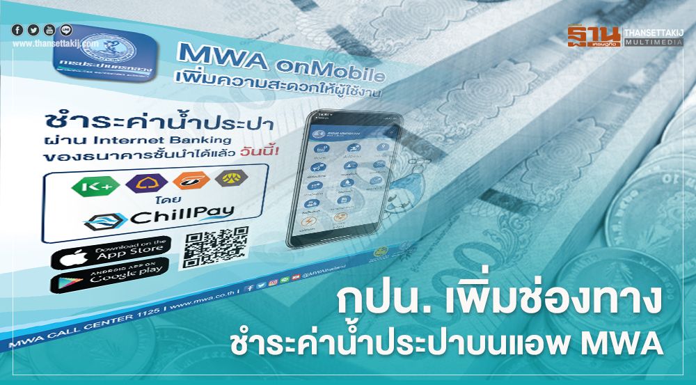 การประปานครหลวง (กปน.) ร่วมกับ บริษัท พระอินทร์ ฟินเทค จำกัด (ChillPay) พัฒนาการให้บริการรับชำระเงินค่าน้ำประปา ค่าติดตั้งประปา ค่าธรรมเนียมการยกเลิกการระงับการใช้น้ำชั่วคราว บนแอพลิเคชัน MWA onMobile ของ กปน. ซึ่งสามารถชำระผ่าน Internet Banking กรณีค่าน้ำประปาเกินกำหนด โดยมีค่าธรรมเนียม 15 บาทต่อรายการ ได้ตั้งแต่วันนี้เป็นต้นไป ส่วนผู้ที่ชำระค่าน้ำตามกำหนด สามารถชำระได้โดยมีค่าธรรมเนียม 13 บาทต่อรายการ