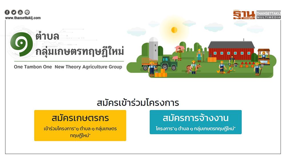 โครงการ 1 ตำบล 1 กลุ่มเกษตรทฤษฎีใหม่ ของกระทรวงเกษตรและสหกรณ์ วงเงิน 9,805.707 ล้านบาท ระยะเวลาดำเนินงาน กรกฎาคม 2563 - กันยายน 2564 ซึ่งมีเป้าหมายเพิ่มรายได้ให้เกษตรกร 64,144 ราย (16 ราย/ตำบล) การจ้างงานเกษตรกร 32,072 ราย (8 ราย/ตำบล) ครอบคลุมพื้นที่ 4,009 ตำบล 75 จังหวัด เปิดรับสมัครแล้ววันนี้(27 สิงหาคม 2563) สามารถสมัครได้ที่ http://ntag.moac.go.th หรือยื่นใบสมัครกับเจ้าหน้าที่เกษตรตำบล หรือที่สำนักงานเกษตรอำเภอ ตั้งแต่ 27 สิงหาคม – 9 กันยายน 2563