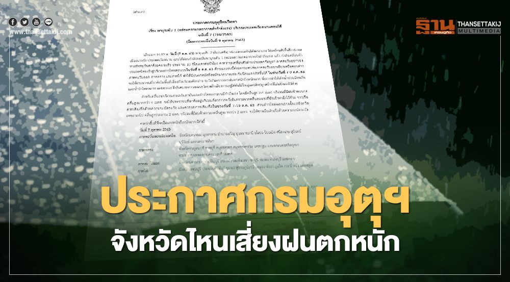 กรมอุตุฯออกประกาศฉบับที่ 7 เตือน "พายุระดับ 1" หลายจังหวัดในภาคตะวันออกเฉียงเหนือตอนล่าง-ภาคตะวันออก-ภาคกลางและภาคใต้ รับมือฝนตกหนักมากในวันที่ 7 -9 ตุลาคม คลื่นลมอันดามัน -อ่าวไทยตอนบนมีกำลังแรงควรงดการเดินเรือในช่วงวันที่ 7-10 ต.ค.