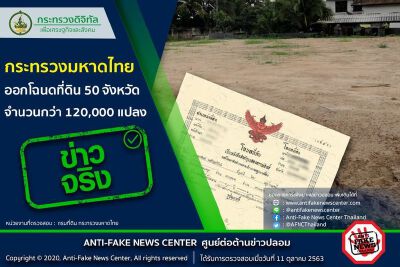 ศูนย์ต่อต้านข่าวปลอม ชี้แจงว่า ตามที่มีข่าวปรากฏในสื่อต่างๆ เกี่ยวกับประเด็นเรื่อง กระทรวงมหาดไทย ออกโฉนดที่ดิน 50 จังหวัด จำนวนกว่า 120,000 แปลง ทางศูนย์ต่อต้านข่าวปลอมได้ดำเนินการตรวจสอบข้อเท็จจริงโดยกรมที่ดิน กระทรวงมหาดไทย พบว่าประเด็นดังกล่าวนั้น เป็นข้อมูลจริง