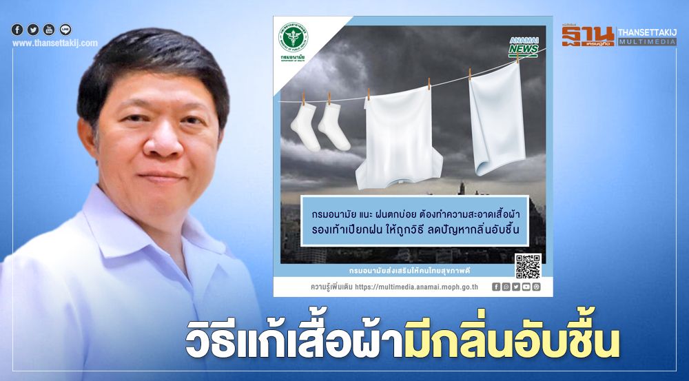 นายแพทย์สุวรรณชัย วัฒนายิ่งเจริญชัย รักษาราชการแทนอธิบดีกรมอนามัย ช่วงนี้ ประเทศไทยได้รับผลกระทบจากพายุดีเปรสชั่น จึงส่งผลให้หลายพื้นที่มีฝนตกตลอดอย่างต่อเนื่อง ทำให้ประชาชนที่ต้องออกไปข้างนอกประสบปัญหาเสื้อผ้ามีกลิ่นอับชื้น เนื่องจากเปียกฝนหรือสวมใส่เสื้อผ้าที่เปียกชื้นเป็นเวลานานๆ หลายชั่วโมง หรือเมื่อกลับถึงบ้านแล้ว ก็ไม่ได้นำเสื้อผ้าที่เปียกไปแขวนให้แห้ง แต่นำไปใส่ตะกร้าเพื่อรอการซัก หากทิ้งไว้นานๆ อาจทำให้เกิดเชื้อราบนเสื้อผ้า หรือแม้ว่าจะซักตากทำความสะอาดเสื้อผ้าเป็นอย่างดีแล้ว แต่เนื่องจากฝนตกทำให้เสื้อผ้าที่ตากไว้ไม่แห้งหรือแห้งไม่สนิท เมื่อนำมาแขวนรวมๆ กัน ก็อาจทำให้เกิดกลิ่นอับชื้น หากนำมาสวมใส่อาจเสี่ยงต่อการเกิดโรคผิวหนังจากเชื้อราตามมา อาทิ โรคกลาก เกลื้อน ซึ่งจะมีลักษณะเป็นผื่นแดง มีขุยรอบ ๆ เกิดอาการคัน ทำให้เป็นผื่นแพ้ และติดเชื้อได้