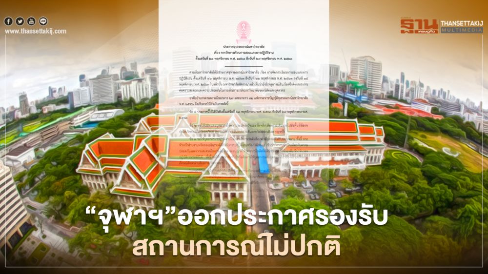 ตามที่มหาวิทยาลัยได้มีประกาศจุฬาลงกรณ์มหาวิทยาลัย เรื่อง การจัดการเรียนการสอนและการปฏิบัติงาน ตั้งแต่วันที่ 16 พฤศจิกายน พ.ศ. 2563 ถึงวันที่ 22 พฤศจิกายน พ.ศ. 2563 ลงวันที่ 15 พฤศจิกายน พ.ศ. 2563 ไปแล้วนั้น มหาวิทยาลัยพิจารณาแล้วเห็นว่ายังมีเหตุการณ์สืบเนื่องซึ่งส่งผลกระทบต่อความสะดวกและความปลอดภัยในการเดินทางมายังมหาวิทยาลัยของนิสิตและบุคลากร