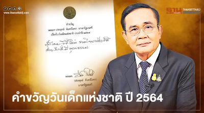 นายกรัฐมนตรี มอบคำขวัญวันเด็กแห่งชาติ ประจำปี 2564 “ เด็กไทยวิถีใหม่ รวมไทยสร้างชาติ ด้วยภักดีมีคุณธรรม”