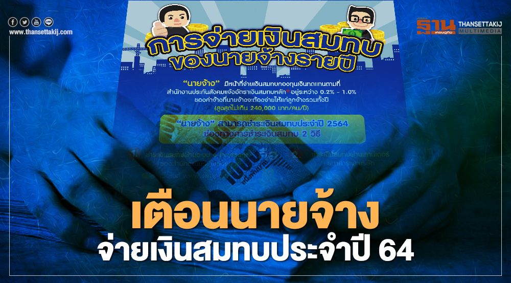 นายทศพล กฤตวงศ์วิมาน เลขาธิการสำนักงานประกันสังคม กระทรวงแรงงาน เปิดเผยว่า ขณะนี้ สำนักงานประกันสังคมได้ดำเนินการจัดส่งใบแจ้งการประเมินเงินสมทบกองทุนเงินทดแทนประจำปี2564 เพื่อให้นายจ้างนำไปชำระเงินสมทบประจำปี 2564 ซึ่งกำหนดชำระเงินสมทบกองทุนเงินทดแทนภายในวันที่ 31 มกราคม 2564 หากพ้นระยะเวลาที่กำหนด ต้องชำระเงินเพิ่มอีกร้อยละ 2 ต่อเดือนของจำนวนเงินสมทบที่ต้องจ่าย