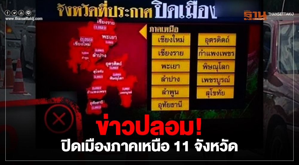ตามที่มีการโพสต์และแชร์ข้อความในสื่อต่างๆ ถึงประเด็นเรื่อง ประกาศปิดเมืองทางภาคเหนือ 11 จังหวัด ทางศูนย์ต่อต้านข่าวปลอมได้ตรวจสอบข้อเท็จจริงโดย กรมควบคุมโรค กระทรวงสาธารณสุข พบว่าข้อมูลดังกล่าวนั้น เป็นข้อมูลเท็จ