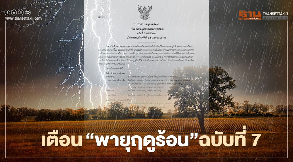 กรมอุตุนิยมวิทยา ประกาศฉบับที่ 7 พายุฤดูร้อนบริเวณประเทศไทย มีผลกระทบตั้งแต่วันที่ 3 - 6 เม.ย.64 วันนี้(3 เม.ย.) 39 จังหวัด ระวังพายุฝนฟ้าคะนอง ลมกระโชกแรง และมีลูกเห็บตกบางพื้นที่ รวมถึงมีฟ้าผ่าเกิดขึ้น