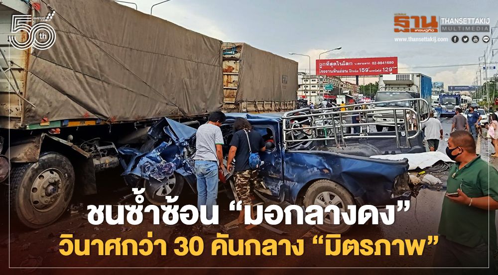 เหตุชนวินาศทางลงเขา"มอกลางดง" ถนนมิตรภาพ เขตอ.ปากช่อง รถเทรเลอร์ 3 คันเฉี่ยวชนขวางถนนรถผ่านไม่ได้จนติดสะสม แล้วมีรถพ่วง 22 ล้อ ลงเขาเบรกไม่อยู่ชนแหวกรถที่จอดรออยู่พังเสียหายกว่า 20 คัน
