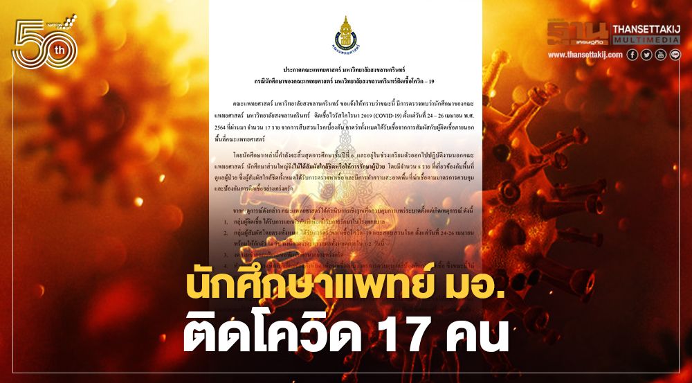วันที่ 27 เมษายน 2564 มีรายงานว่า คณะแพทยศาสตร์ มหาวิทยาลัยสงขลานครินทร์ (ม.อ.) ออกประกาศ ว่า มีนักศึกษาของคณะแพทย์ติดเชื้อโควิค-19 มีรายละเอียดว่า คณะแพทยศาสตร์ มหาวิทยาลัยสงขลานครินทร์ ขอแจ้งให้ทราบ ว่า ขณะนี้มีการตรวจพบว่านักศึกษาของคณะแพทยศาสตร์ มอ.ติดเชื้อไวรัสโคโรน่า 2019 ตั้งแต่วันที่ 24 – 26 เมษายนที่ผ่านมา จำนวน 17 ราย