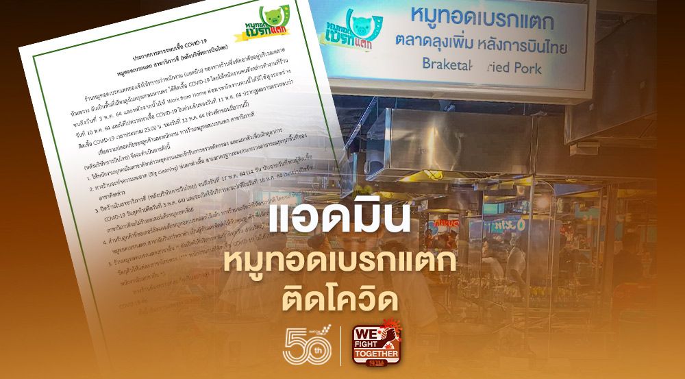 ร้านหมูทอดเบรกแตกแจ้งพบพนักงาน (แอดมิน) ซึ่งพักอาศัยอยู่บริเวณตลาดห้วยขวาง อันเป็นพื้นที่เสี่ยงสูงใน กรุงเทพมหานคร ติดเชื้อCOVID -19 โดยพนักงานดังกล่าวได้เข้าทำงานที่ร้านจนถึงวันที่3 พฤษาคม 2564 ซึ่งหลังจากนั้นได้ Work from home ก่อนจะมีไข้สูงระหว่างวันที่ 10 พฤษภาคม 2564 และเข้ารับการตรวจหาเชื้อ COVID -19 ปรากฏผลตรวจพบว่าติดเชื้อ COVID -19 เมื่อกลางดึกวันที่ 12 พฤษภาคม 2564