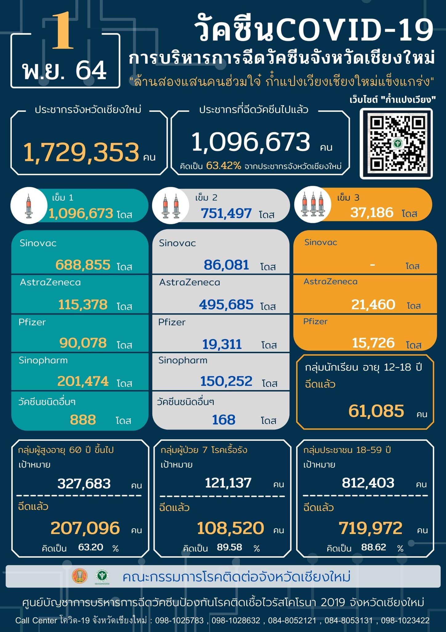 อนึ่ง จังหวัดเชียงใหม่มีผู้ได้รับการฉีดวัคซีนไปแล้ว 1,096,673 คน คิดเป็นร้อยละ 63.42 จากประชากรทั้งหมดของจังหวัดเชียงใหม่ โดยแบ่งเป็นกลุ่มผู้สูงอายุ 60 ปีขึ้นไป ฉีดแล้ว 207,096 คน คิดเป็นร้อยละ 63.20 กลุ่ม 7 โรคเรื้อรังฉีดแล้ว 108,520 คน คิดเป็นร้อยละ 89.58 และกลุ่มประชาชนทั่วไป ฉีดแล้ว 719,972 คน คิดเป็นร้อยละ 88.62