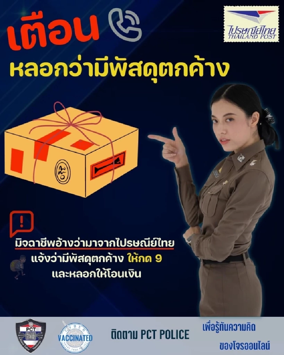 วันนี้(31 ก.ค.65) ที่ สำนักงานตำรวจแห่งชาติ พล.ต.อ.ดำรงศักดิ์ กิตติประภัสร์ รอง ผบ.ตร. ผู้อำนวยการศูนย์ปราบปรามอาชญากรรมทางเทคโนโลยีสารสนเทศ สำนักงานตำรวจแห่งชาติ (ศปอส.ตร.) หรือ PCT เปิดเผยว่า ปัจจุบันกลุ่มมิจฉาชีพอ้างเป็นไปรษณีย์โทรศัพท์หลอกลวงว่า มีพัสดุตกค้างและเกี่ยวข้องกับคดีฟอกเงิน หลอกขอข้อมูลส่วนตัว และให้เหยื่อโอนเงินไปให้ตรวจสอบ มีประชาชนยังหลงเชื่ออยู่เป็นจำนวนมาก