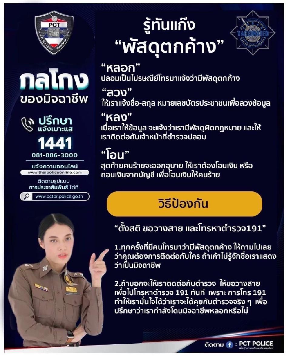จึงอยากฝากเตือนประชาชนให้มีสติคิดก่อนจะโอนเงินให้ใคร หากสงสัยเกรงจะตกเป็นเหยื่อสามารถปรึกษาได้ที่ สายด่วน บช.สอท. 1441 หรือ ศูนย์ PCT 081-8663000 ผู้เสียหายสามารถแจ้งความผ่านระบบออนไลน์ได้ที่เว็บไซต์ www.thaipoliceonline.com และสามารถติดตามรูปแบบการประชาสัมพันธ์กลโกงได้ที่ pctpr.police.go.th