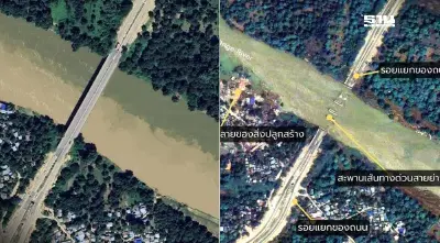 ภาพถ่ายจากดาวเทียม THEOS-2 พบรอยแยกของถนน สะพานเส้นทางด่วนสายย่างกุ้ง-มัณฑะเลย์ข้ามแม่น้ำอิรวดีพังถล่ม และการพังทลายของสิ่งปลูกสร้างพื้นที่ริมแม่น้ำอิรวดี