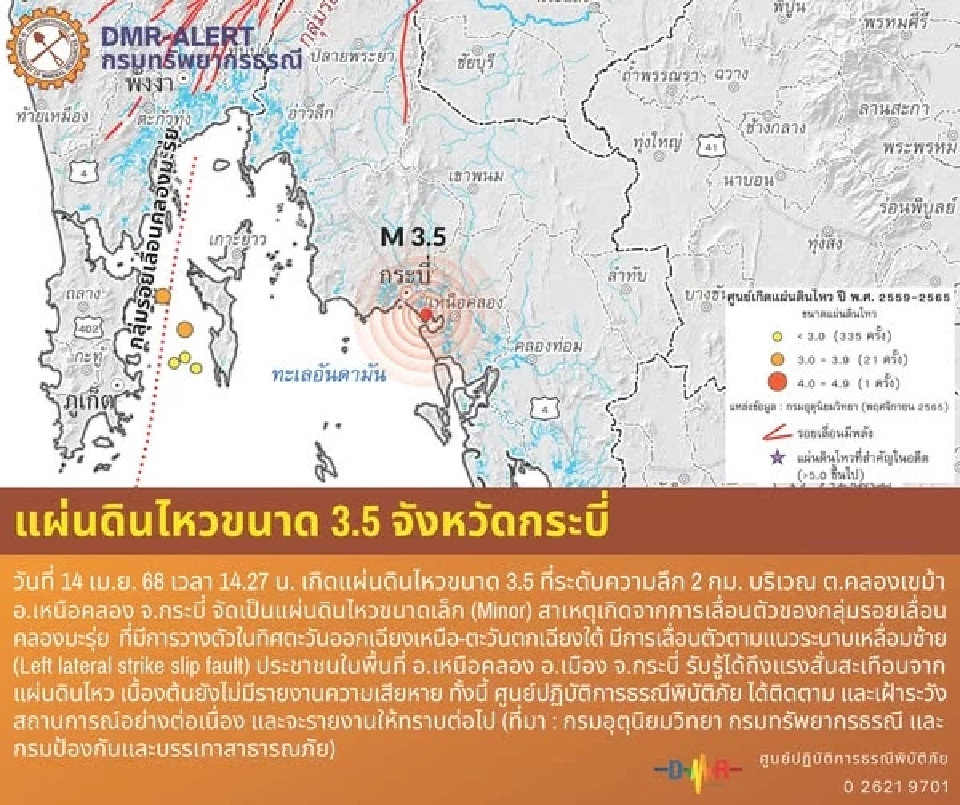 เมื่อเวลา 14.27 น. วันที่ 14 เมษายน 2568 กรมอุตุนิยมวิทยา ออกประกาศแจ้งเหตุแผ่นดินไหวในพื้นที่ ต.คลองเขม้า อ.เหนือคลอง จ.กระบี่ จุดศูนย์กลางแผ่นดินไหวอยู่ที่ละติจูด 8.022 องศาเหนือ ลองจิจูด 98.978 องศาตะวันออก มีขนาด 3.5 ลึกจากผิวดินประมาณ 2 กิโลเมตร