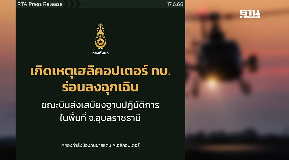วันนี้ (17มิ.ย.68) เวลา 17.00 น. ศูนย์ประชาสัมพันธ์กองทัพบก โดยทีมโฆษกกองทัพบก เผยแพร่ข้อมูลผ่านเฟซบุ๊ก "กองทัพบก Royal Thai Army" ระบุว่า กองทัพภาคที่ 2 แจงเกิดเหตุเฮลิคอปเตอร์ร่อนลงฉุกเฉิน ขณะปฏิบัติภารกิจส่งเสบียงให้ฐานปฏิบัติการในพื้นที่ จ.อุบลราชธานี