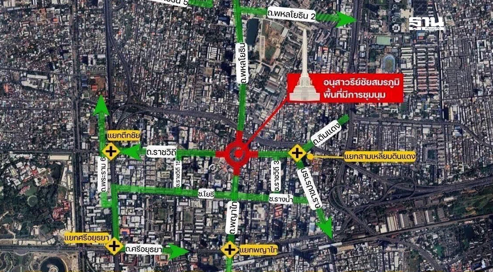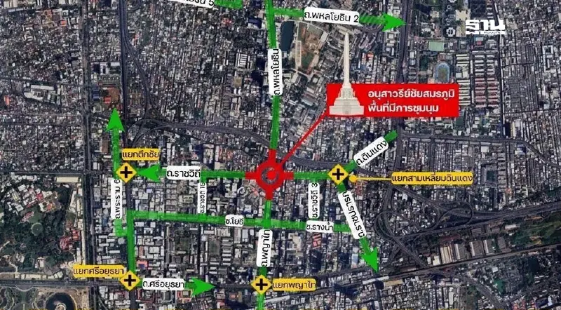 เนื่องจากจะมี การชุมนุมบริเวณอนุสาวรีย์ชัยสมรภูมิ อาจส่งผลกระทบต่อการจราจรโดยรอบ ขอความร่วมมือประชาชนผู้ใช้รถใช้ถนน หลีกเลี่ยงเส้นทางตามจุดสำคัญ ดังนี้