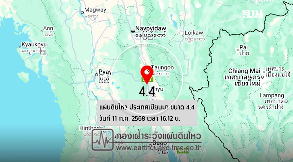 วันที่ 11 กรกฎาคม 2568 กองเฝ้าระวังแผ่นดินไหว กรมอุตุนิยมวิทยา รายงานว่า เมื่อเวลา 16.12 น.ได้เกิดเหตุแผ่นดินไหวขนาด 4.4 ลึก 10 กิโลเมตร ที่ประเทศเมียนมา โดยอยู่ทางทิศตะวันตกเฉียงใต้ของ อ.ขุนยวม จ.แม่ฮ่องสอน ประมาณ 165 กิโลเมตร เบื้องต้นไม่มีรายงานการรับรู้แรงสั่นไหวในไทย