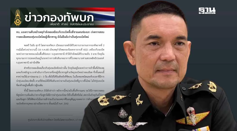 พลตรี วินธัย สุวารี โฆษกกองทัพบก เปิดเผยภายหลังได้รับทราบรายงานจากกองทัพภาคที่ 2 กรณีเมื่อช่วงบ่ายวานนี้ (16 ก.ค.68) เกิดเหตุกำลังพลกองร้อยทหารราบที่ 6021 เหยียบกับระเบิดระหว่างการลาดตระเวนในพื้นที่ช่องบก จ.อุบลราชธานี ทำให้กำลังพลได้รับบาดเจ็บ 3 นาย ปัจจุบัน ทุกนายอาการปลอดภัยอยู่ในระหว่างการพักสังเกตอาการที่โรงพยาบาลค่ายสรรพสิทธิประสงค์ จ.อุบลราชธานี อย่างใกล้ชิด