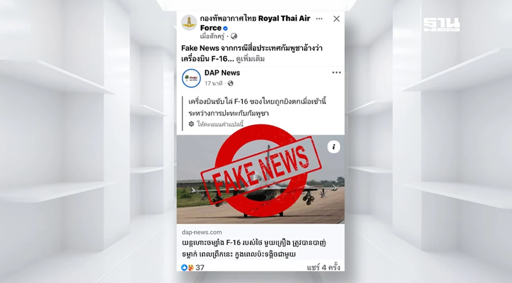 โดยเนื้อหาระบุว่า แหล่งข่าวที่เชื่อถือได้ยืนยันว่า เครื่องบินรบ F-16 ของกองทัพอากาศไทยถูกยิงตกโดยกองทัพกัมพูชา ท่ามกลางความตึงเครียดที่เพิ่มขึ้นตามแนวชายแดนไทย-กัมพูชา