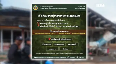 ผู้ว่าราชการจังหวัดสุรินทร์ แจ้งเตือนประชาชน 1–3 วันนี้ โปรดหลีกเลี่ยงพื้นที่เสี่ยง ไม่ควรอยู่ในพื้นที่รวมกลุ่มคนจำนวนมาก หลีกเลี่ยงพื้นที่ในรัศมี 120 กม. จากชายแดนไทย–กัมพูชา