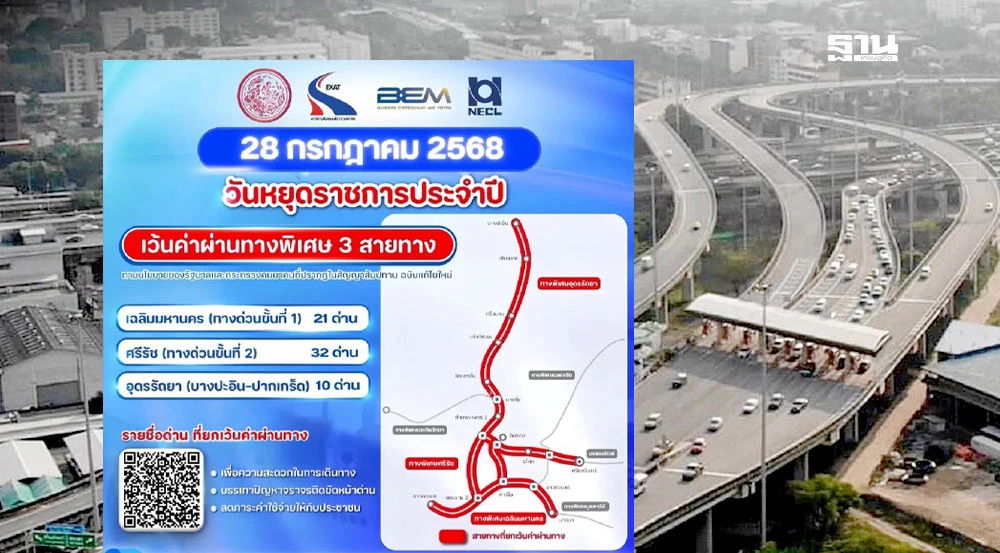 วันหยุดราชการ 'ขึ้นทางด่วนฟรี' วันที่ 28 กรกฎาคม 2568 วันเฉลิมพระชนมพรรษา พระบาทสมเด็จพระเจ้าอยู่หัว รัชกาลที่ 10 การทางพิเศษแห่งประเทศไทย (กทพ.) แจ้ง 'ยกเว้นค่าผ่านทางพิเศษ' หรือทางด่วนของทางพิเศษ 3 สายทาง รวม 63 ด่านได้แก่